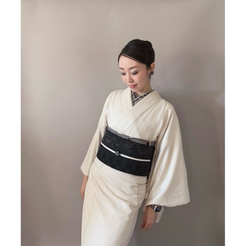 センスの塊のような先生で、この着物コーデのような「半衿にリボンを使う」アイディアも先生から学ばせていただきました。幅広のリボンを両面テープで貼っているだけなので、とっても簡単。